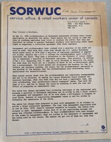 SORWUC- Service, Office and Retail Workers Union Canada The Service, Office and Retail Workers Union of Canada (SORWUC) was an independent union, established in 1972 by a Founding Convention of 24 women, with the intention of representing and organizing occupations that were not included in the traditional trade unions of the time. The union developed out of the Working Women’s Association, an organization that sought to provide support to the adversities facing working women, such as obtaining equal pay, day care provision, and job security. SORWUC was an unaffiliated, feminist, member-controlled union, and their constitution stated their aims as being: to bargain collectively on behalf of members; to improve working conditions; and to help provide job security. By 1976, SORWUC had organized four day care centres, five social service units, one legal office, one student office, and a tuxedo rental store. SORWUC also began organizing bank workers in 1975 and eventually established a specific chapter for the workers in the finance industry, Local 2, United Bank Workers, and later, Local 4, Bank and Finance Workers. The union was financially supported by its members and by donations from other unions and organizations, and ran its offices on a volunteer basis. [https://guides.library.ubc.ca/labourhistoryarchives/sorwuc] -